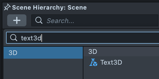 To create the Text3D component. Go to Scene Hierarchy > +, and type Text3D.
