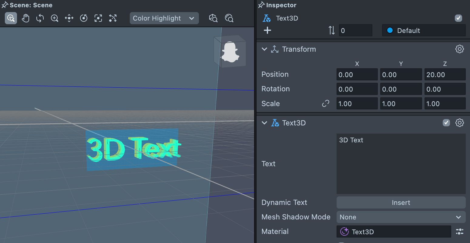 Enter any text in the Text field on the Text3D component to change the 3D text.