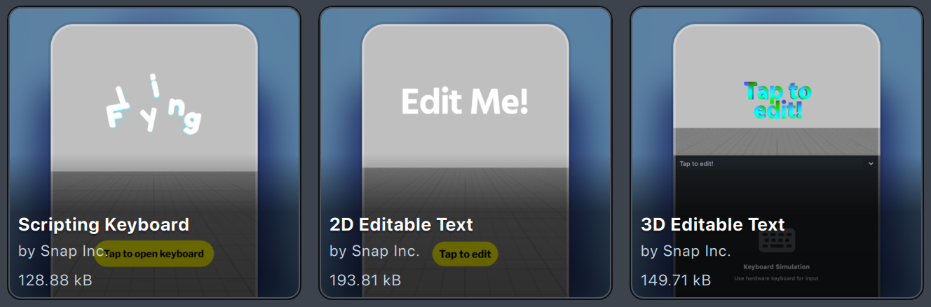 Scripting Keyboard, 2D Editable Text and 3D Editable Text examples covered in this guide are available in Lens Studio Asset Library. Import them into your project and follow instructions in the object prefab name.