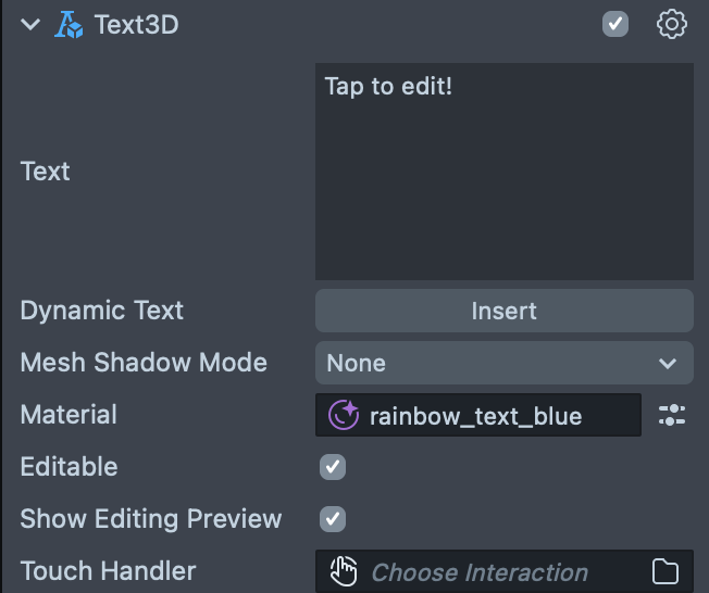 The Image component requires an Interaction component and is set as a Touch Handler input of the Text component we want to edit.