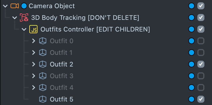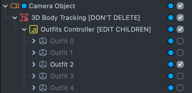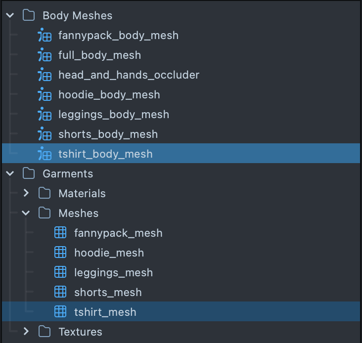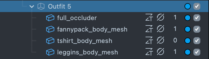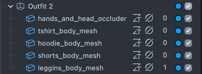 Each outfit consists of several Render Mesh Visuals that are used to visualize garment meshes and optionally an occluder that can use a full or partial Body Mesh to occlude your outfits.