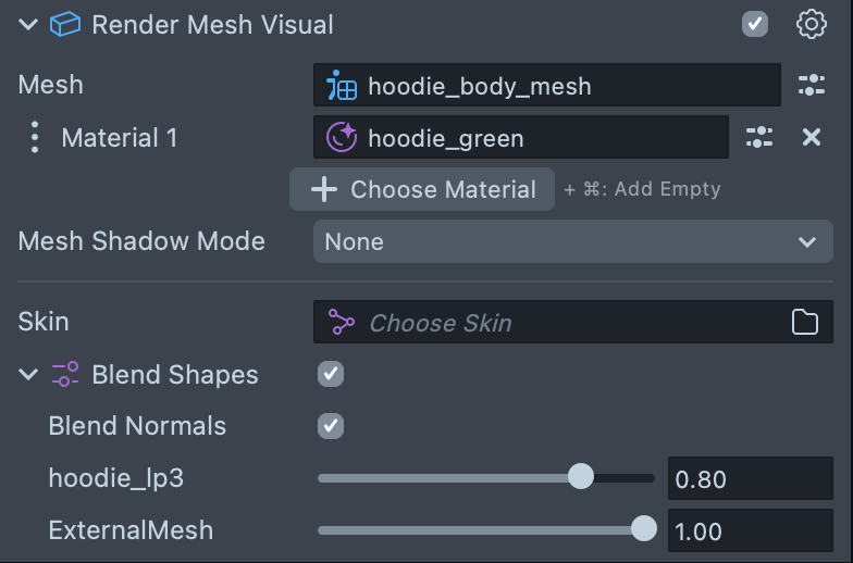 Swap materials by clicking on the material field of the Render Mesh Visualin the Inspector panel (additional materials are available for certain meshes). Optionally change the ExternalMesh blendshape or other available blendshapes weights. For example, you can try changing the blendshape weight on the hoodie_body_mesh to open or close zipper.
