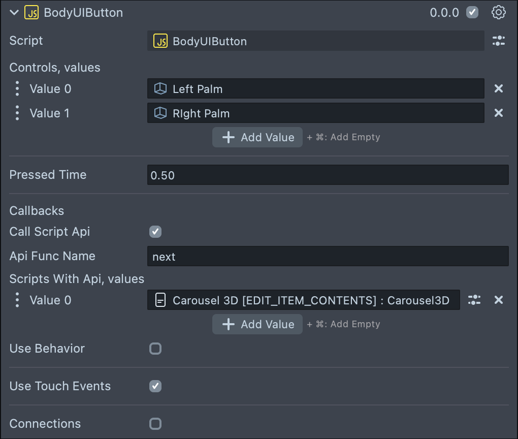 Body UI Button: A script that allows adding callbacks to the button placed in 3D space and allows certain scene objects to interact with it. Allows you to set up a pressed time that is required in order to trigger attached callbacks.