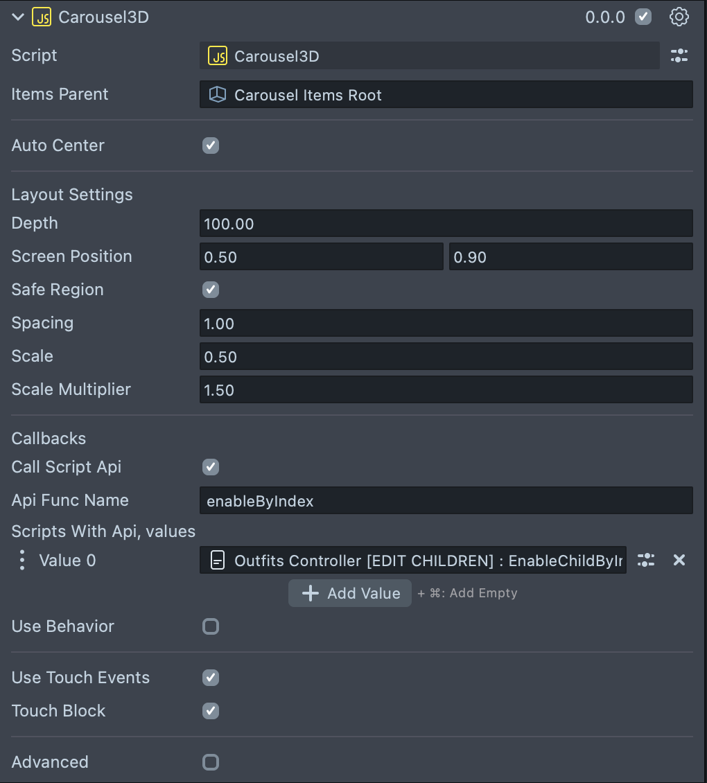- Enable Touch Events: allows you to use Touch Events to control the button. Useful for debugging in Lens Studio.