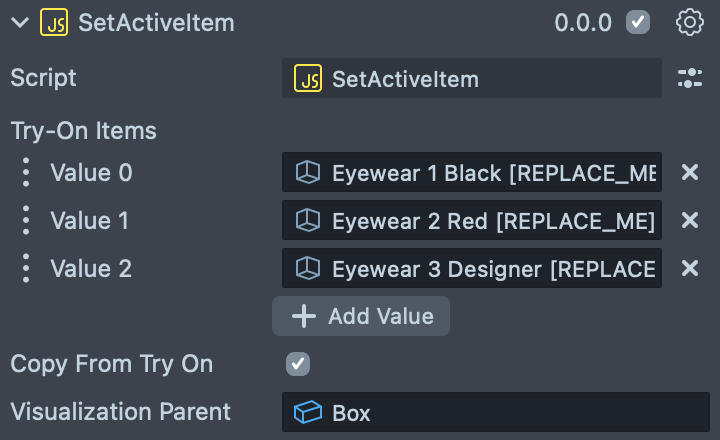 Set Active Itemscript. If you need more items, use theAdd Valuebutton.