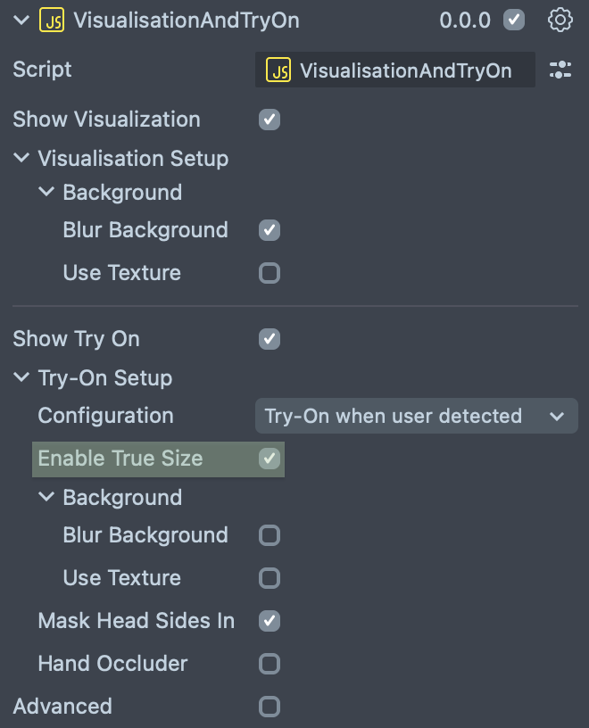 To Enable "True Size", select Visualization & Try-On Scene Object in the Scene Hierarchy panel located under Template Controls