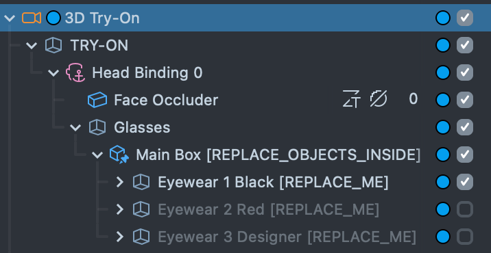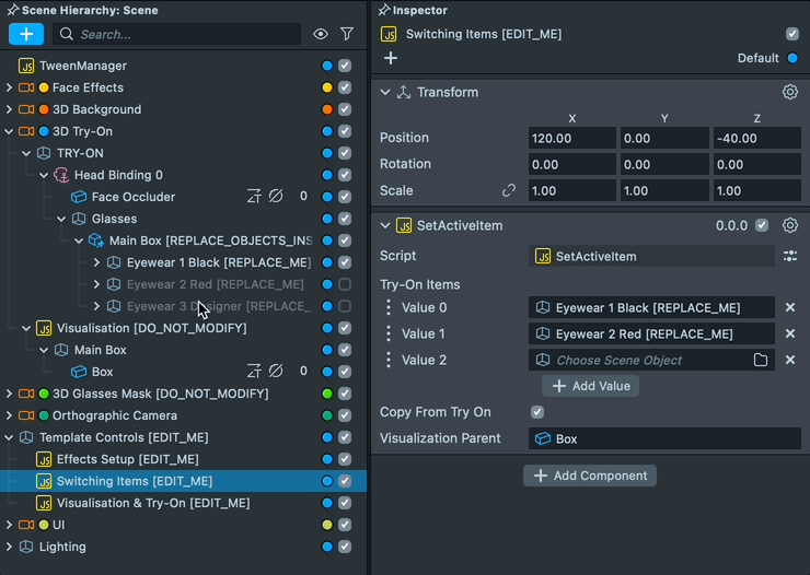 If you change the glasses 3D models (see below), make sure to change their reference in this script as well. It will connect these models to the Carousel UI and enable smooth toggling of different models.