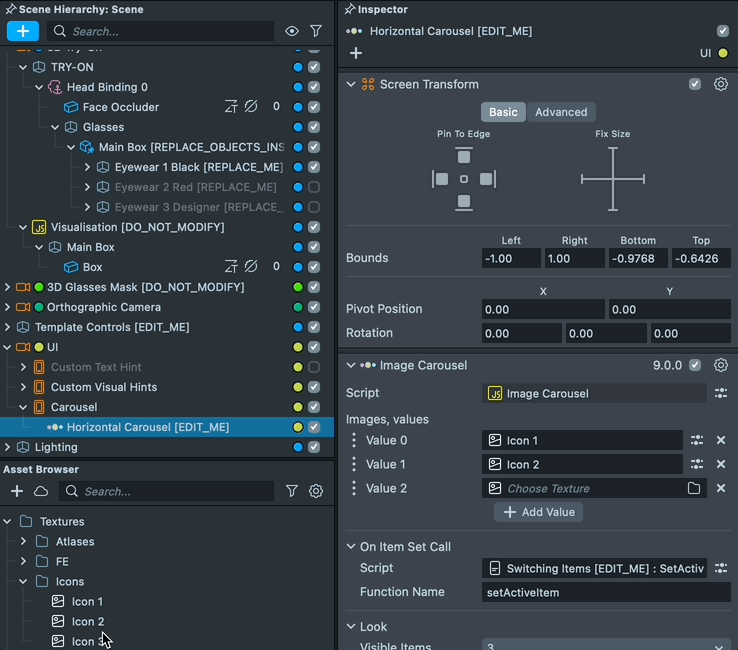 Horizontal Carousel [EDIT_ME]Scene Object. If you need more items, use theAdd Valuebutton
