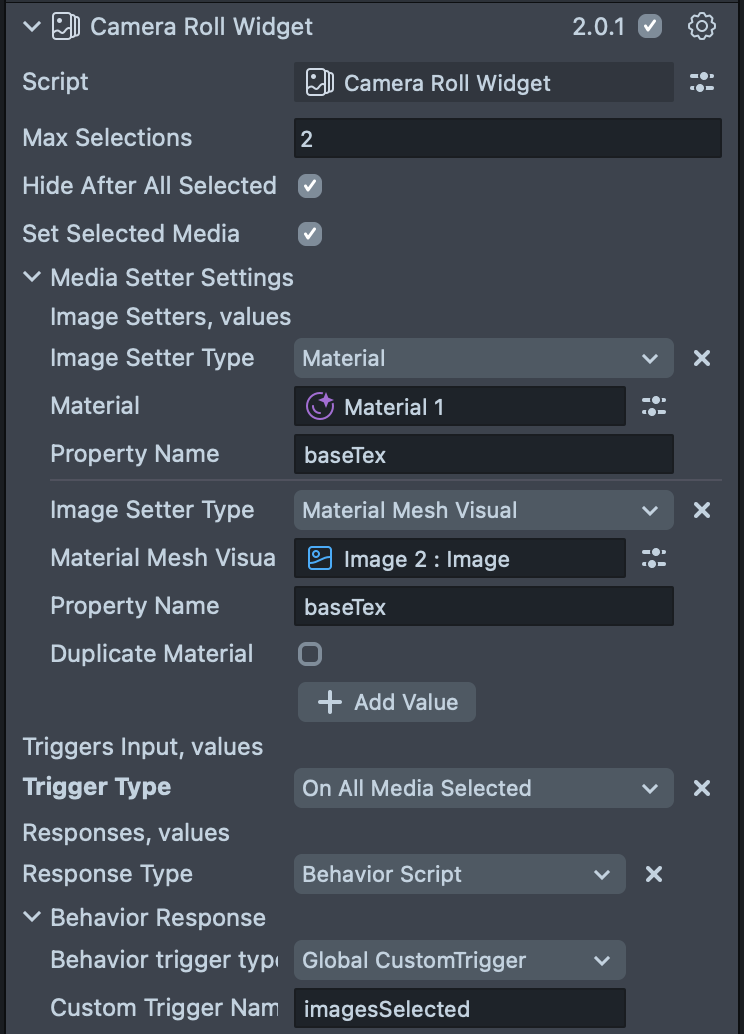 | Set Selected Media | boolean | If enabled, displays selected photos or videos on a scene object using the Media Setter. |