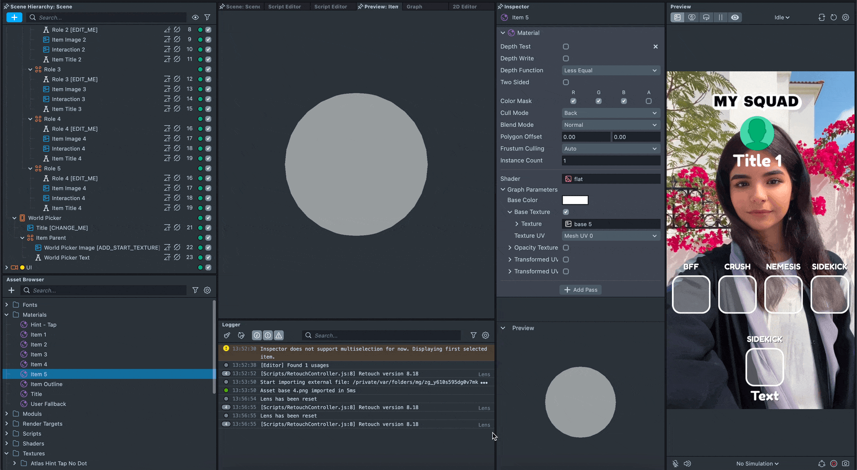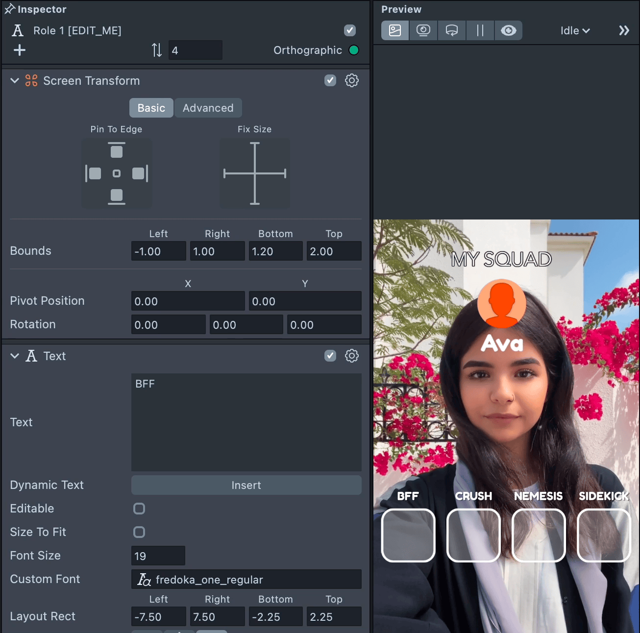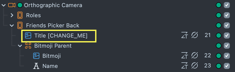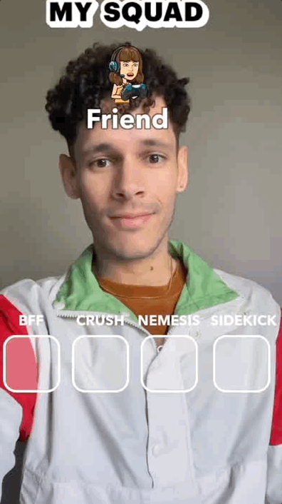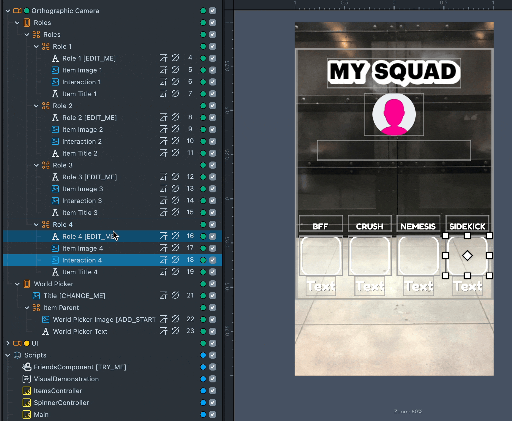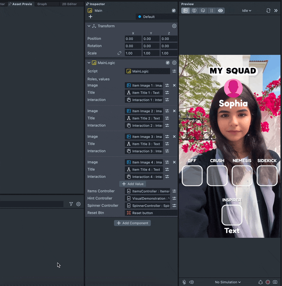 This sample project provides an interactive way to select roles in your Lens. The template is designed to sort through Snapchatter's friends or any customizable items. Upon launching the lens, an item or a friend from the Snapchatter's list is randomly chosen and displayed as an image (Bitmoji) accompanied by a label (or the friend's name). The Snapchatter can then assign a specific role to the chosen item or friend, associated with a particular function or characteristic. This scenario repeats until all roles are assigned.