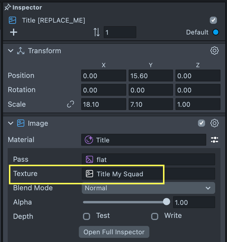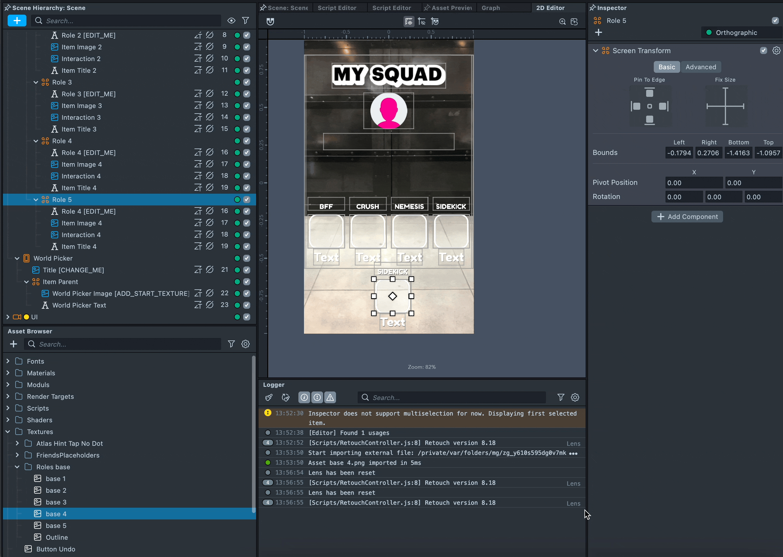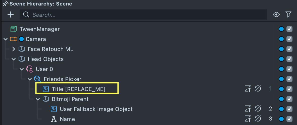 Next, you’ll want to name your project. To change the title, find the Tween Manager in the Scene Hierarchy panel. Expand the Camera section and navigate to the Friends Picker. Find the Title [REPLACE_ME] object. For example, type in MY SQUAD, and replace the texture in the Image component.