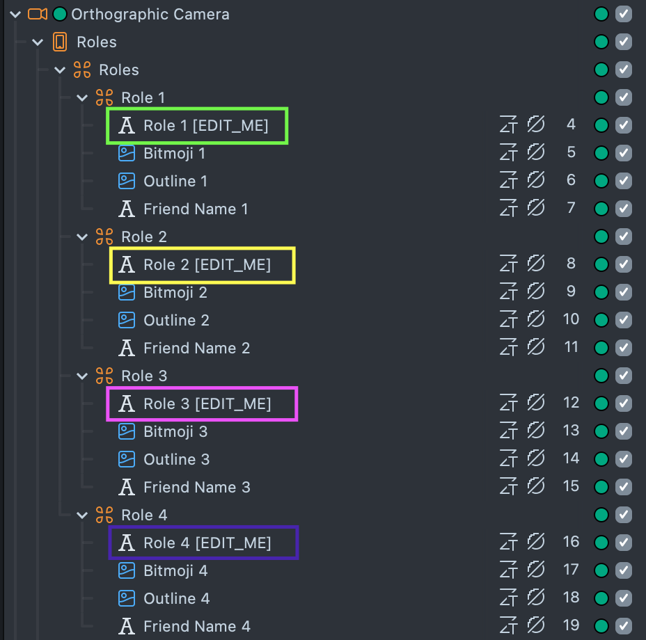 To customize the role names: Go to the Orthographic Camera and edit the Text components of objects marked [EDIT_ME].