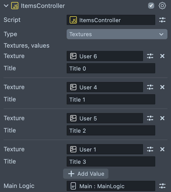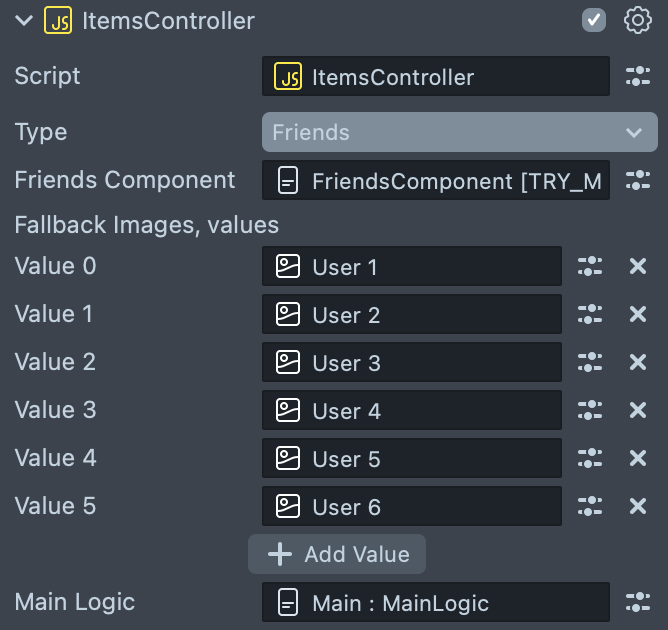 To choose Friends or Images sorting: select the ItemsController and choose the desired Type in the ScriptComponent's inputs.