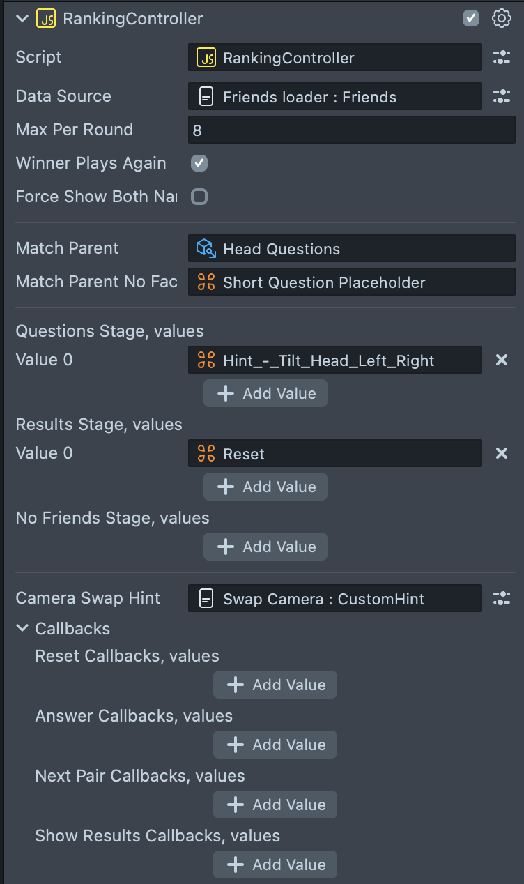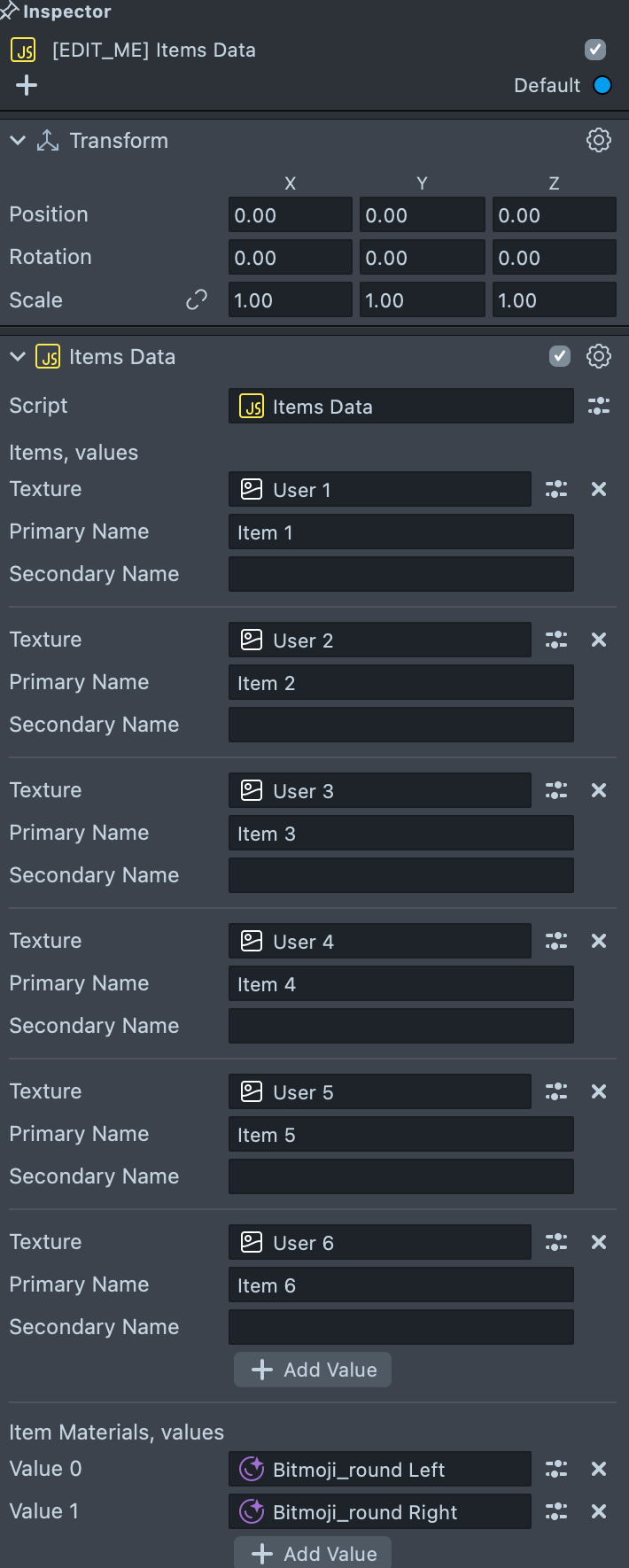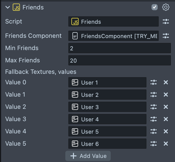 In the input data of the Friends Loader script, you can specify the minimum and maximum number of friends to be selected for the game, and add a fallback texture to be applied to friends who do not have Bitmoji.