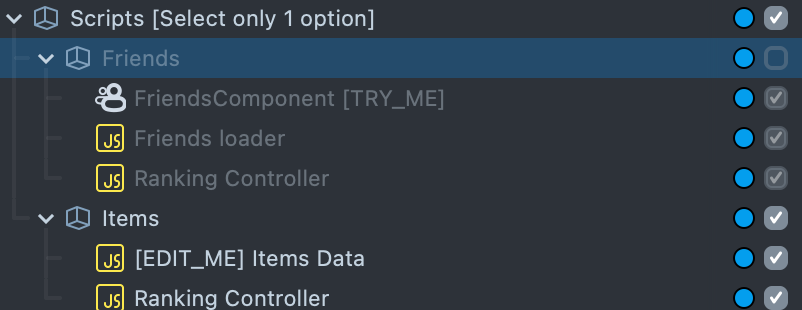 modes by turning ON/OFF Friends and Items objects under the Scripts [Select only 1 option]: