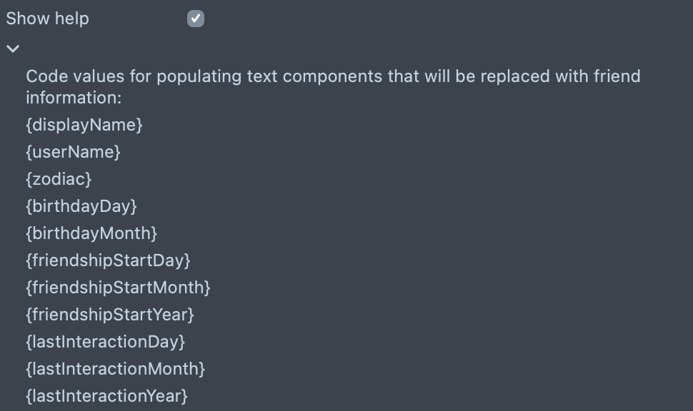 Show Help - boolean to show the list of values that would substituted with the friend information.