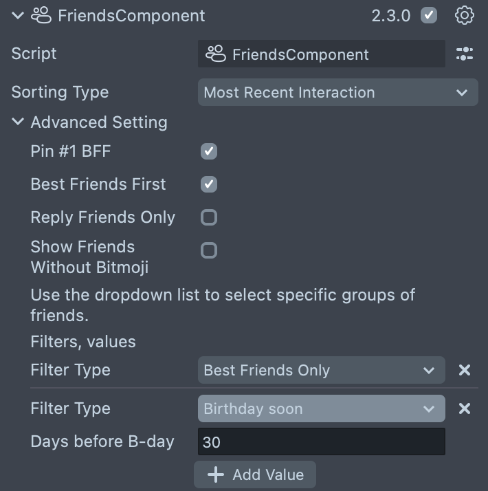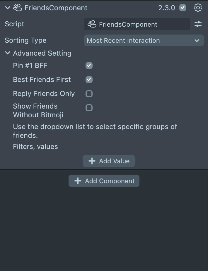 Add the FriendComponent to an empty SceneObject and fill in the required inputs. You can select the sorting type, as well as the filters by which friends will be selected.