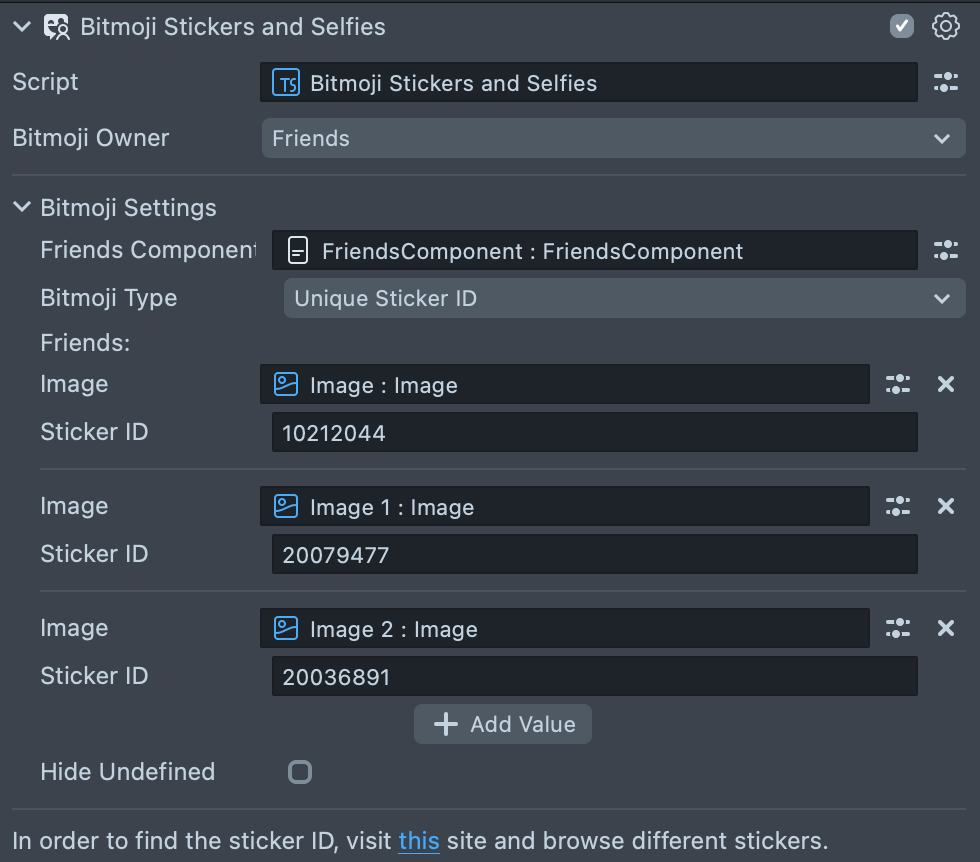 When using the Bitmoji Selfies And Stickers component and select Friends in the BitmojiOwner input, specify from which FriendsComponent you want to retrieve the list of friends. Then specify the Image Components where the Bitmoji of friends is obtained from FriendsComponent will be added.