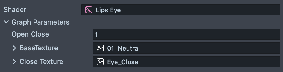 Left-click on the material to select it. The Open Close field represents the open or close state of the eyes. Modify the int from 1 to 0. You can see the eye closed in the Preview panel. With the material, only the upper half of the texture will be replaced by the Eye_Close Texture.