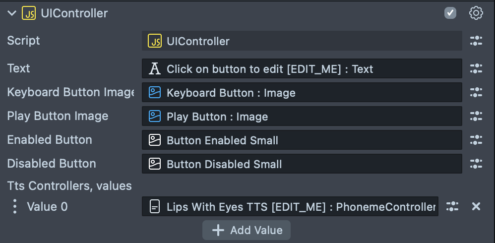 UI Controller script attached to UI Controller [EDIT_ME] scene object is used to handle the UI interaction.