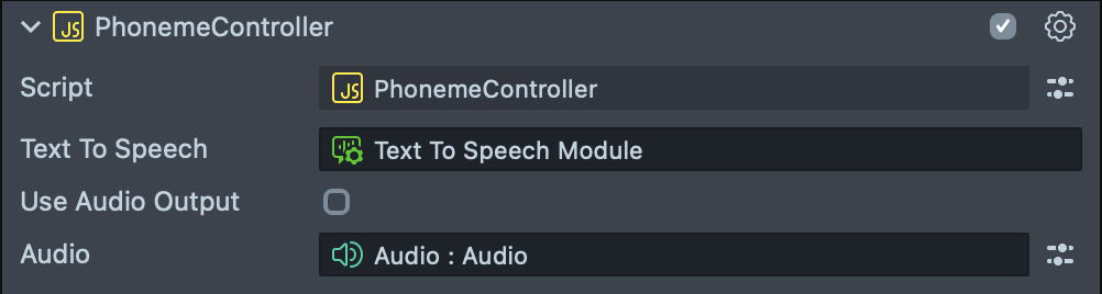 The Phoneme Animation is driven by the main helper script PhonemeController (attached to Lips With Eyes TTS [EDIT_ME] scene object). You can see a Text To Speech Module and an Audio Component connected to the Phoneme Controller script component through inputs.