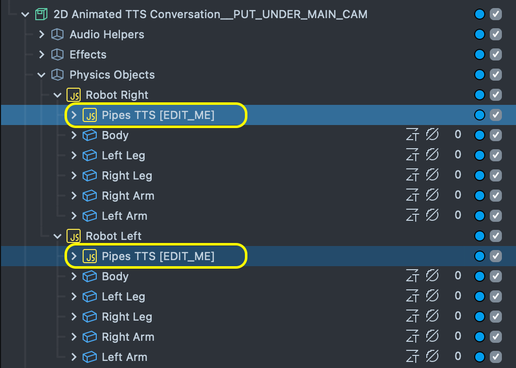 This Example utilizes same PhonemeController as in previous example. This script is attached to Pipes TTS [EDIT_ME] scene objects as shown on image below.