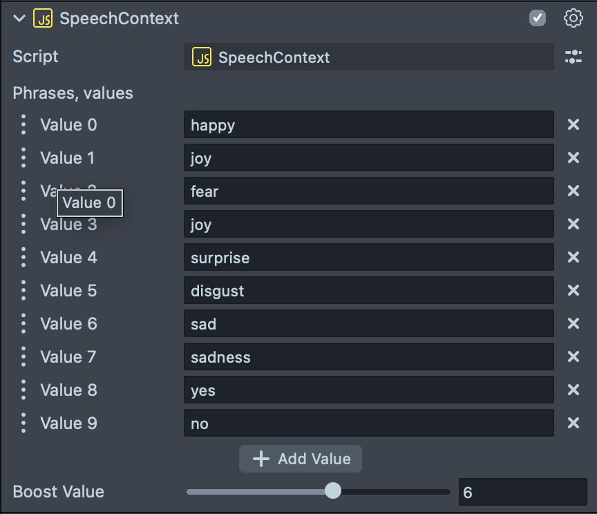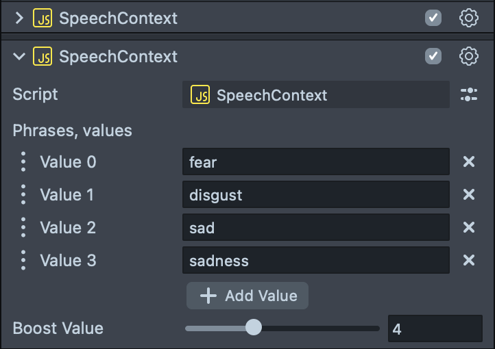 Select the SpeechContexts [EDIT_ME] scene object in Scene Hierarchy. Attached script allows to add words to the phrases and set a boost value for the phrases. To add a new word, click on the Add Value field and input the word you want to add.