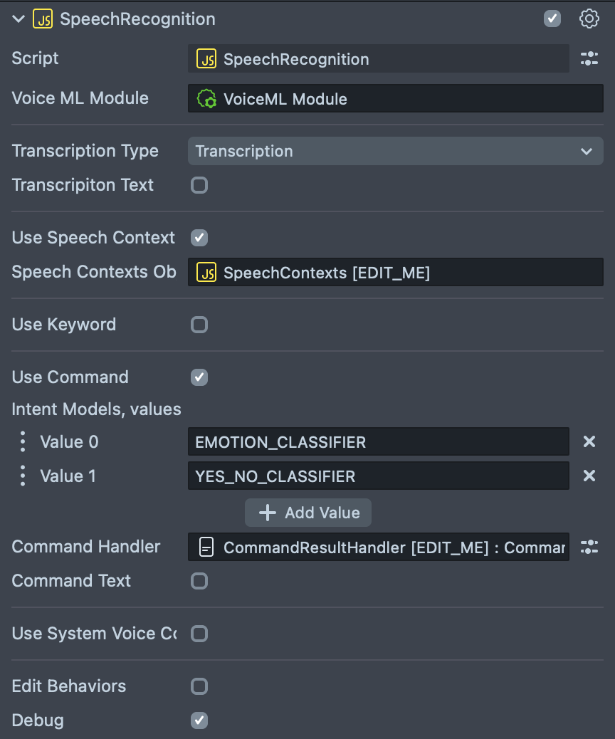 - Debug : if enabled prints out detected voice events in the Logger panel.