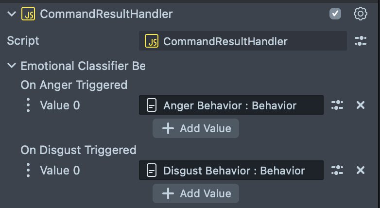 - Command Handler: a reference to a CommandResultHandler script that allows to define responses for detected intents.