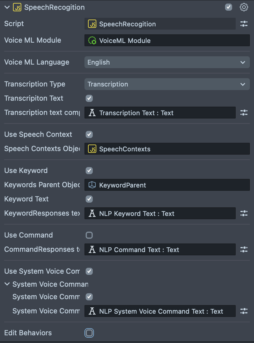 For each voice event, multiple instances of Behavior script can be set: - On Listening Enabled: Behavior scripts triggered when the microphone is enabled. - On Listening Disabled: Behavior scripts triggered when the microphone is disabled. - On Listening Triggered: Behavior scripts triggered when changed back to listening mode. - On Error Triggered: Behavior scripts triggered when there is error in the transcription. - On Final Transcription Triggered: Behavior scripts triggered when it's a full result, or partial transcription. - On Command Detected: Behavior scripts triggered when any command is detected.