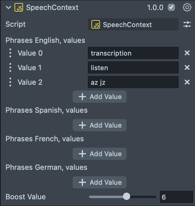 With Speech Context script we can add words to the phrases and set a boost value for the phrases. To add a new word, click on the Add Value field and input a new word you want to add.