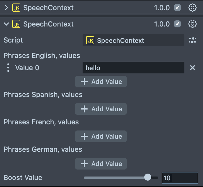- Speech Contexts Object: reference to a Speech Context script.