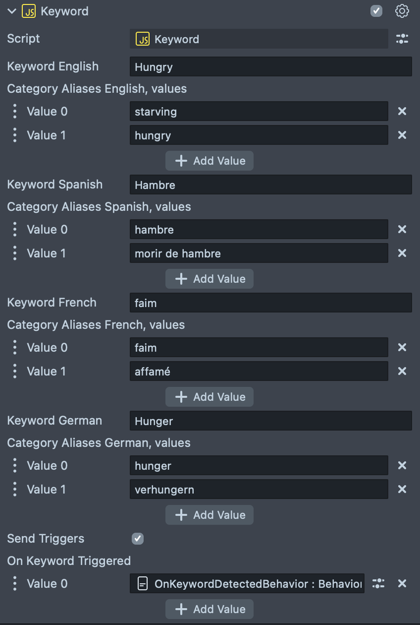 - Send Triggers checkbox - allows to specify a list of Behavior scripts to trigger if keyword is detected.