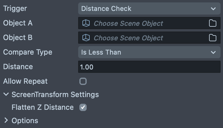 - Flatten Z Distance: Use this option when using distance check on a Screen Transform.