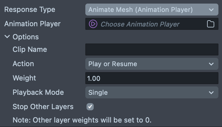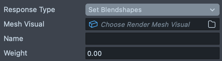 The Set Blendshapes response type sets a blend shape weight on a BlendShapes component for a 3D Animation.