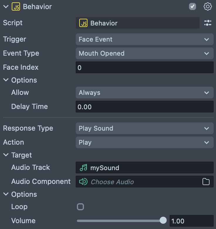 In the below example, I've configured the Trigger to Mouth Opened. Next, I've configured the Response to Play Sound. The resulting interaction is - when the user opens their mouth -> play a sound.