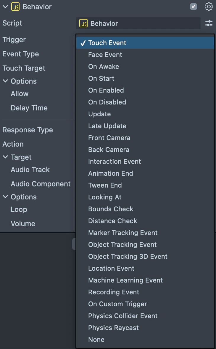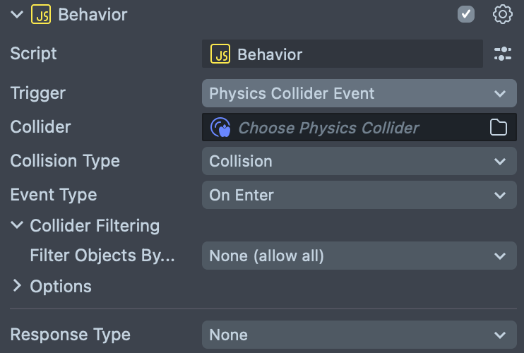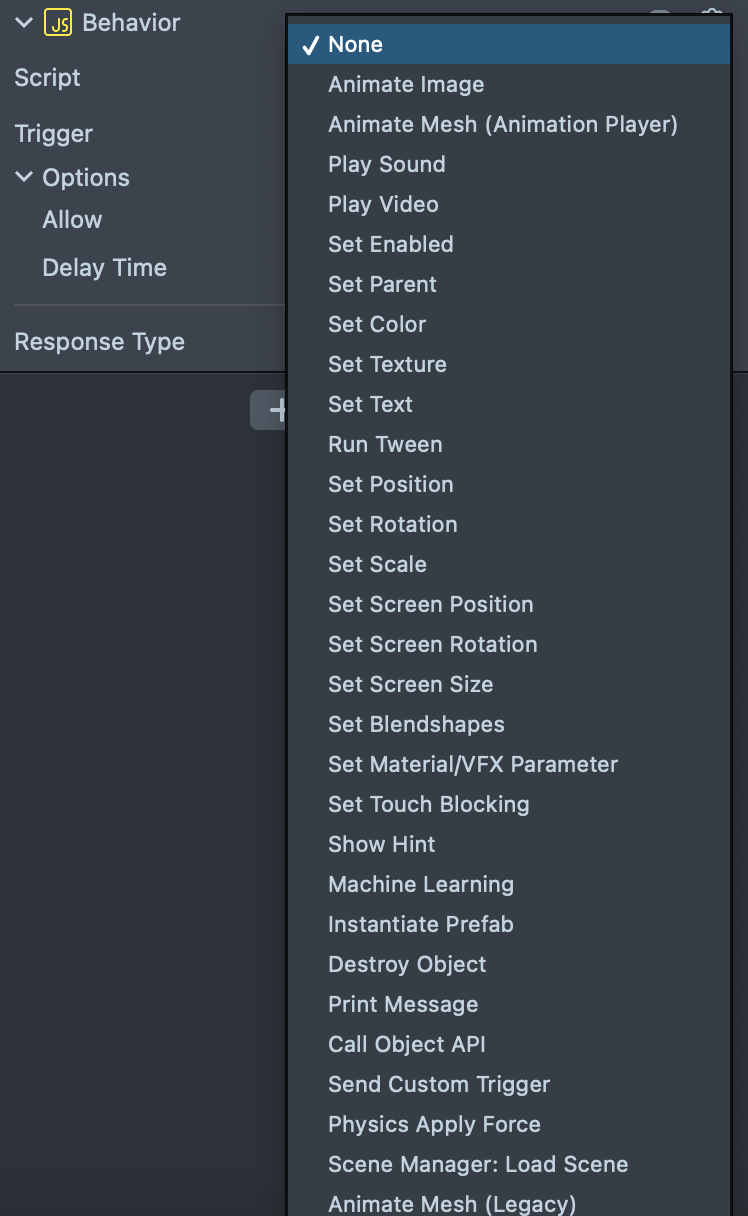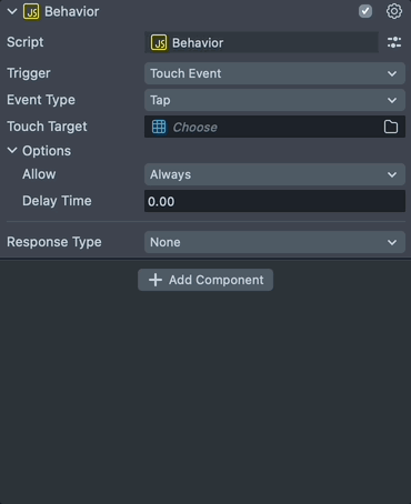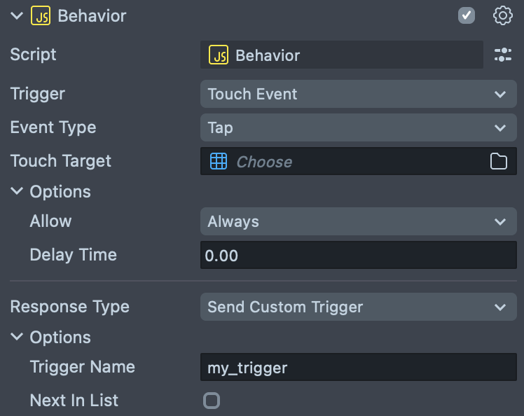 The Behavior helper script offers a number of Trigger Types via the Trigger dropdown. When the Trigger happens, the Behavior helper script will fire the Response.