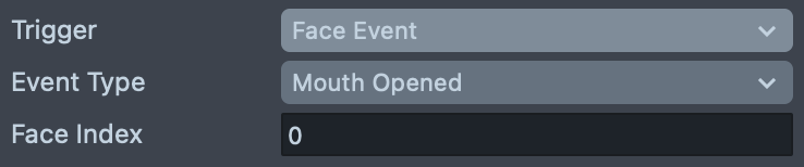 Mouth Opened,Brows Raised,Face Found,Kiss Started,Smile Startedand more - Face Index: The face to look for the trigger on. When two faces are in the scene, the first face found is
