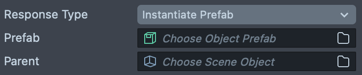 The Instantiate Prefab response type instantiates the Prefab into the scene, and optionally gives the new object a Parent.