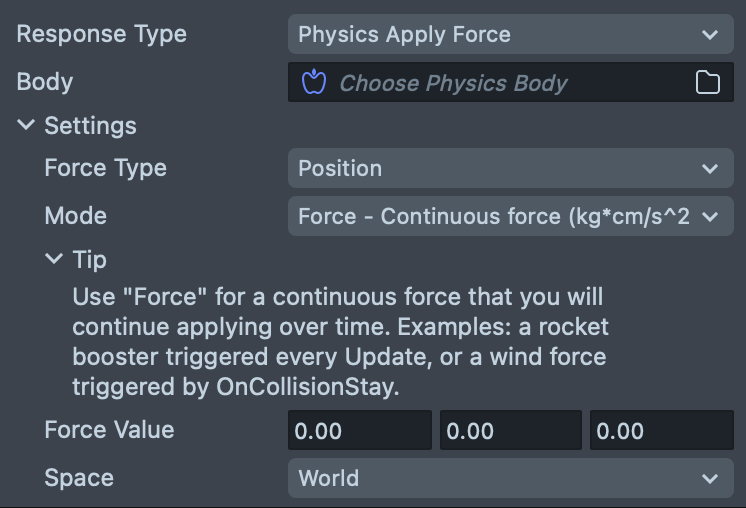 Force,Acceleration,Impulse,Velocity Change,Set Velocity. - Force Value: How much force should be applied.