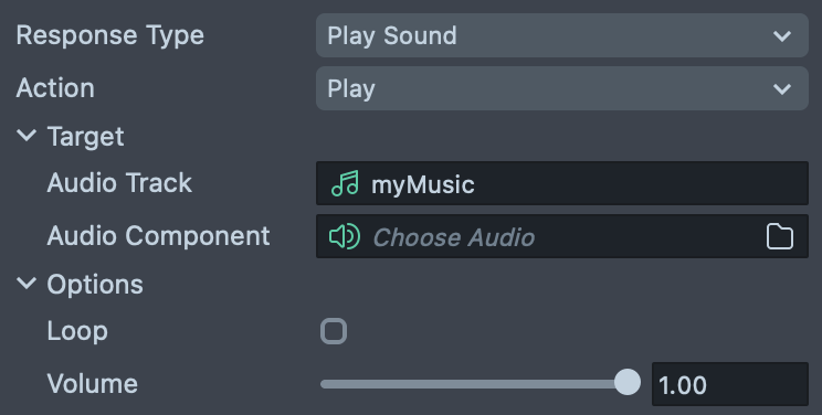 In the example below, we first set the Trigger to the Face Event type: Brows Raised. Then, we set the Response Type to Play Sound. Finally, we configure the sound we want to play in the response type's settings. The resulting interaction is - when the user's eyebrows are raised -> play a sound.