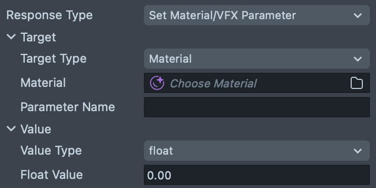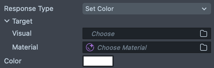 The Set Material Parameter response type allows you to modify a material's parameter--for example, allowing you to change the base color of the default PBR material.