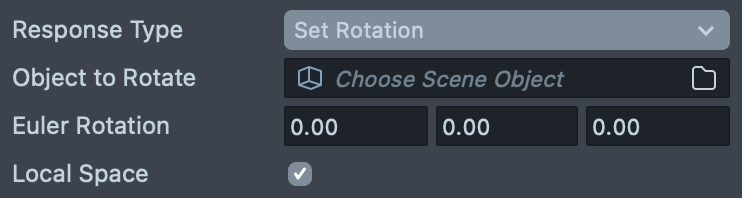 The Set Screen Rotation response type sets the rotation of an object with a Screen Transform. For example, a Screen Image or Screen Text object.