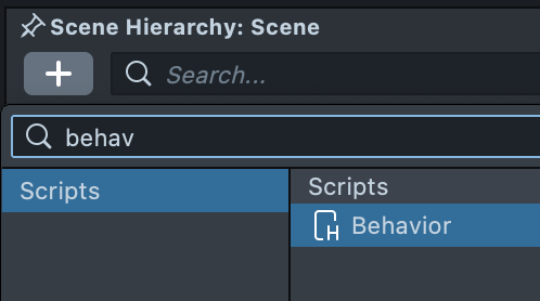 To add the Behavior helper script, in the Scene Hierarchy panel select + -> Scripts -> Behavior. This will create a new object with the Behavior helper script added to it.