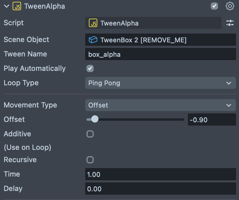 Offsetand Loop Type is set toLoop, the tween will continue to be offset at each loop iteration rather than reset to its original start value. - Delay: How long to wait before starting the tween.