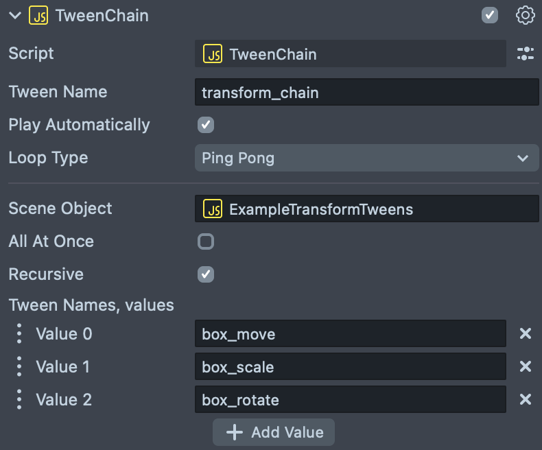 TweenTypescript components to be used in thisTweenChain. This field allows you to separate your base tweens from the object itself. If this field is left empty, theTweenChainwill useTweenTypescript components attached to the object that the script component has been added to. - All At Once: If enabled, all specified