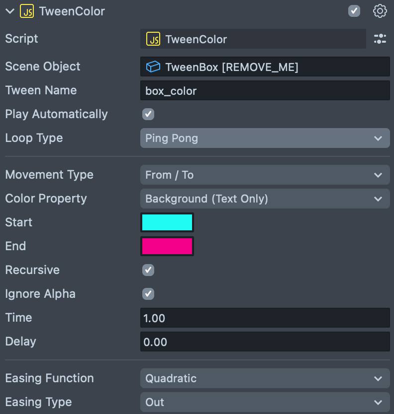 - Color Property: Specifies the color property to tween.