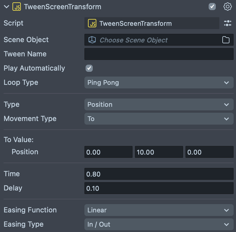 - Scene Object: The object you want to apply the tween to. This field allows you to separate your tween tuning from the object itself. If this field is left empty, the tween is applied to the object that the script component has been added to.