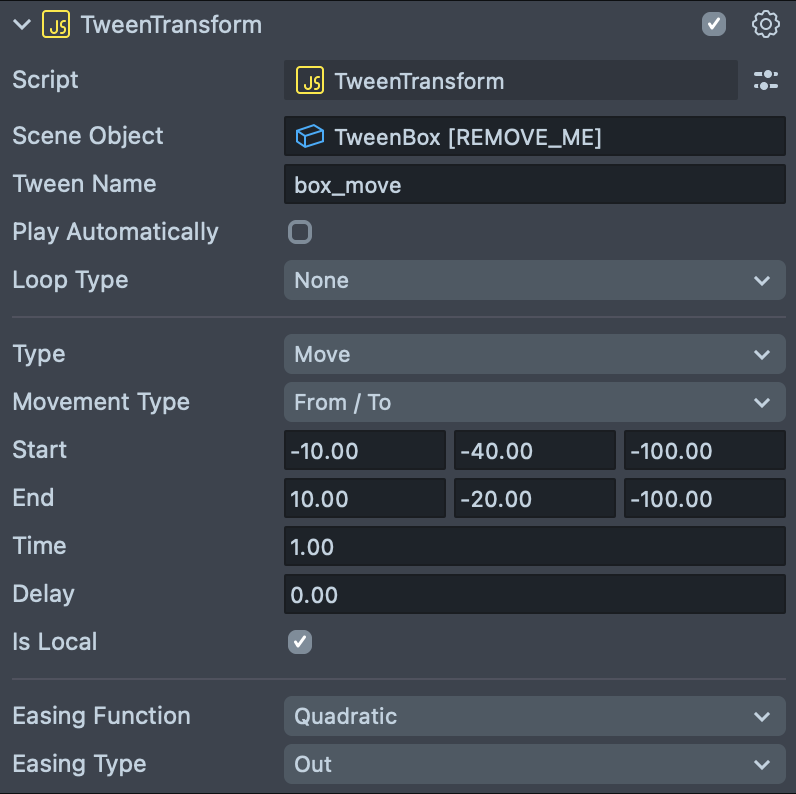 - Offset: A vec3 that represents the offset from the tween's start value (only available if Offset is chosen as the Movement Type).