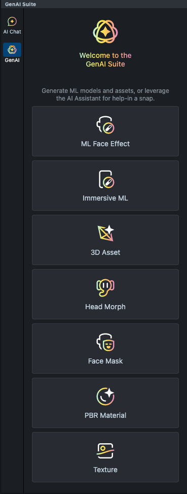 The AI Assistant panel can be found and enabled by pressing the GenAI Suite button () in the top right of Lens Studio.